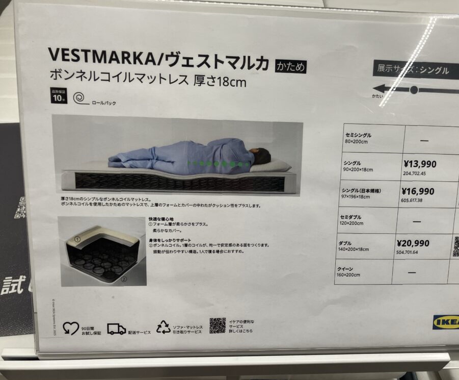 今回はシングルのマットレス2枚購入し、使っていたダブルのマットレスを回収してもらうことになりました。ダブルでシングル2枚分の計算となるよう。そのため回収は一枚だけとのこと。